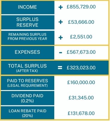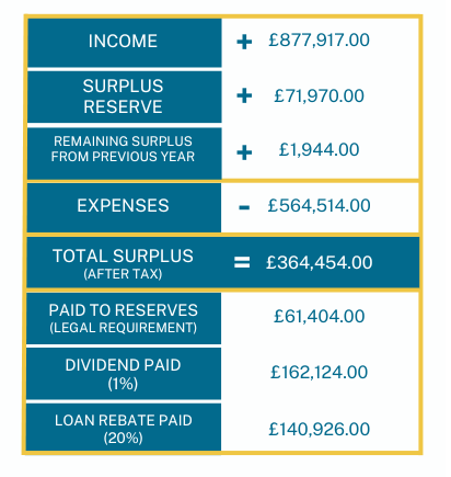 For the last 2 years (ending 30th September 2022 & 2023 respectively) the loan interest rebate has been 20%. Meaning that one fifth of the interest you paid on your loan throughout the year (Oct - Sept) was paid back to your savings following our AGM in December.