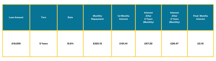 This example shows that on a loan of £10,000 over a 5 year term with a monthly repayment of £222.15 the first interest payable on the first repayment is £101.41, meaning that £120.74 comes off the loan balance. The interest reduces with each repayment as it is charged on the remaining balance of the loan.