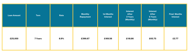 This example shows that on a loan of £25,000 over a 7 year term with a monthly repayment of £396.67 the first interest payable on the first repayment is £169.56, meaning that £227.11 comes off the loan balance. The interest reduces with each repayment as it is charged on the remaining balance of the loan.
